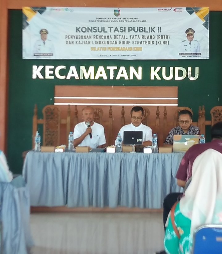 Kudu, 23 Oktober 2025 – Pemerintah Kabupaten Jombang melalui,Dinas Pekerjaan Umum dan Penataan Ruang (PUPR) menyelenggarakan Konsultasi Publik II Penyusunan Rencana Detail Tata Ruang (RDTR) dan Kajian Lingkungan Hidup Strategis (KLHS) RDTR Wilayah Perencanaan Kecamatan Kudu, bertempat di Pendopo Kecamatan Kudu, Kamis (23/10/2025).